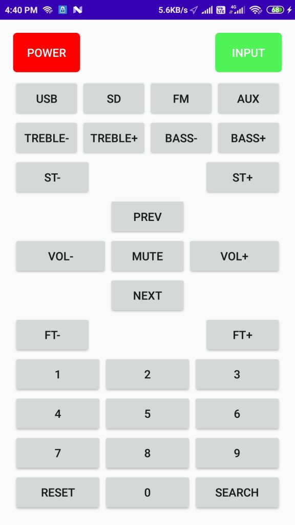 Create Remote in Android using ConsumerIrManager Android by Rajesh Kumar Sahanee - February 28, 2020April 4, 20200 Post Views: 5,158 Hello friends, today we are going to learn how to create remote in android using ConsumerIrManager. ConsumerIrManager class operates consumer infrared on the device and we’ll use two methods of ConsumerIrManager class hasIrEmitter method to check whether device has infrared emitter or not and transmit method to transmit single/pattern. Actually I have Clarion JM-8201 home theater and I have lost it’s remote and for that reason I was facing difficulties using it and I have tried many apps from playstore but no one worked for me so I decided to develop own remote app. Now I am sharing this code so that anyone else need it can benefit and If anyone have same home theater then s/he can use same code as it is to create their own remote for their home theater. So, Here is the code MainActivity.java MainActivity.java Java package com.zatackcoder.clarionremotejm8201; import androidx.annotation.RequiresApi; import androidx.appcompat.app.AppCompatActivity; import android.hardware.ConsumerIrManager; import android.os.Build; import android.os.Bundle; import android.view.View; import android.widget.Toast; public class MainActivity extends AppCompatActivity { Integer frequency = 33000; @Override protected void onCreate(Bundle savedInstanceState) { super.onCreate(savedInstanceState); setContentView(R.layout.activity_main); } @RequiresApi(api = Build.VERSION_CODES.KITKAT) public void handleClick(View view) { ConsumerIrManager consumerIrManager = (ConsumerIrManager) getSystemService(CONSUMER_IR_SERVICE); if(!consumerIrManager.hasIrEmitter()) { Toast.makeText(getApplicationContext(), "IR Emitter Not Found in Your Device", Toast.LENGTH_LONG).show(); return; } switch (view.getId()) { case R.id.powerB: consumerIrManager.transmit(frequency, Btn.POWER); break; case R.id.inputB: consumerIrManager.transmit(frequency, Btn.INPUT); break; case R.id.usbB: consumerIrManager.transmit(frequency, Btn.USB); break; case R.id.sdB: consumerIrManager.transmit(frequency, Btn.SD); break; case R.id.fmB: consumerIrManager.transmit(frequency, Btn.FM); break; case R.id.auxB: consumerIrManager.transmit(frequency, Btn.AUX); break; case R.id.trebleMinusB: consumerIrManager.transmit(frequency, Btn.TREBLE_MINUS); break; case R.id.treblePlusB: consumerIrManager.transmit(frequency, Btn.TREBLE_PLUS); break; case R.id.bassMinusB: consumerIrManager.transmit(frequency, Btn.BASS_MINUS); break; case R.id.bassPlusB: consumerIrManager.transmit(frequency, Btn.BASS_PLUS); break; case R.id.stMinusB: consumerIrManager.transmit(frequency, Btn.ST_MINUS); break; case R.id.stPlusB: consumerIrManager.transmit(frequency, Btn.ST_PLUS); break; case R.id.prevB: consumerIrManager.transmit(frequency, Btn.PREVIOUS); break; case R.id.volMinusB: consumerIrManager.transmit(frequency, Btn.VOL_MINUS); break; case R.id.nextB: consumerIrManager.transmit(frequency, Btn.NEXT); break; case R.id.volPlusB: consumerIrManager.transmit(frequency, Btn.VOL_PLUS); break; case R.id.muteB: consumerIrManager.transmit(frequency, Btn.MUTE); break; case R.id.ftMinusB: consumerIrManager.transmit(frequency, Btn.FT_MINUS); break; case R.id.ftPlusB: consumerIrManager.transmit(frequency, Btn.FT_PLUS); break; case R.id.num1B: consumerIrManager.transmit(frequency, Btn.NUM_1); break; case R.id.num2B: consumerIrManager.transmit(frequency, Btn.NUM_2); break; case R.id.num3B: consumerIrManager.transmit(frequency, Btn.NUM_3); break; case R.id.num4B: consumerIrManager.transmit(frequency, Btn.NUM_4); break; case R.id.num5B: consumerIrManager.transmit(frequency, Btn.NUM_5); break; case R.id.num6B: consumerIrManager.transmit(frequency, Btn.NUM_6); break; case R.id.num7B: consumerIrManager.transmit(frequency, Btn.NUM_7); break; case R.id.num8B: consumerIrManager.transmit(frequency, Btn.NUM_8); break; case R.id.num9B: consumerIrManager.transmit(frequency, Btn.NUM_9); break; case R.id.num0B: consumerIrManager.transmit(frequency, Btn.NUM_0); break; case R.id.resetB: consumerIrManager.transmit(frequency, Btn.RESET); break; case R.id.searchB: consumerIrManager.transmit(frequency, Btn.SEARCH); break; } } } 123456789101112131415161718192021222324252627282930313233343536373839404142434445464748495051525354555657585960616263646566676869707172737475767778798081828384858687888990919293949596979899100101102103104105106107108109110111112113114115116117118119120121122123124125126 package com.zatackcoder.clarionremotejm8201; import androidx.annotation.RequiresApi;import androidx.appcompat.app.AppCompatActivity; import android.hardware.ConsumerIrManager;import android.os.Build;import android.os.Bundle;import android.view.View;import android.widget.Toast; public class MainActivity extends AppCompatActivity { Integer frequency = 33000; @Override protected void onCreate(Bundle savedInstanceState) { super.onCreate(savedInstanceState); setContentView(R.layout.activity_main); } @RequiresApi(api = Build.VERSION_CODES.KITKAT) public void handleClick(View view) { ConsumerIrManager consumerIrManager = (ConsumerIrManager) getSystemService(CONSUMER_IR_SERVICE); if(!consumerIrManager.hasIrEmitter()) { Toast.makeText(getApplicationContext(), "IR Emitter Not Found in Your Device", Toast.LENGTH_LONG).show(); return; } switch (view.getId()) { case R.id.powerB: consumerIrManager.transmit(frequency, Btn.POWER); break; case R.id.inputB: consumerIrManager.transmit(frequency, Btn.INPUT); break; case R.id.usbB: consumerIrManager.transmit(frequency, Btn.USB); break; case R.id.sdB: consumerIrManager.transmit(frequency, Btn.SD); break; case R.id.fmB: consumerIrManager.transmit(frequency, Btn.FM); break; case R.id.auxB: consumerIrManager.transmit(frequency, Btn.AUX); break; case R.id.trebleMinusB: consumerIrManager.transmit(frequency, Btn.TREBLE_MINUS); break; case R.id.treblePlusB: consumerIrManager.transmit(frequency, Btn.TREBLE_PLUS); break; case R.id.bassMinusB: consumerIrManager.transmit(frequency, Btn.B