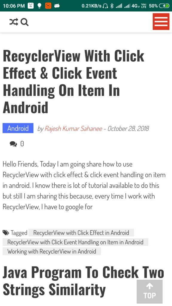 WebView Based Android App Android by Rajesh Kumar Sahanee - January 30, 2019February 4, 20190 Post Views: 6,360 Hello Friends, Today I am going to share how to create WebView based Android App. WebView based app is nothing but a App in which we call website url in WebView. You can create WebView based app in just few minutes but the condition is website should be responsive to make it look like an App. So, here is the code. MainActivity.java MainActivity.java Java package com.zatackcoder.webviewapp; import android.app.ProgressDialog; import android.content.Context; import android.graphics.Bitmap; import android.net.ConnectivityManager; import android.net.NetworkInfo; import android.support.v7.app.AppCompatActivity; import android.os.Bundle; import android.view.View; import android.webkit.WebChromeClient; import android.webkit.WebView; import android.webkit.WebViewClient; import android.widget.Toast; public class MainActivity extends AppCompatActivity { WebView webView; ProgressDialog progressDialog; String url = "https://zatackcoder.com"; @Override protected void onCreate(Bundle savedInstanceState) { super.onCreate(savedInstanceState); setContentView(R.layout.activity_main); initControls(); } private void initControls() { webView = findViewById(R.id.webview); progressDialog = ProgressDialog.show(MainActivity.this, "", "Please Wait ...", true); webView.setWebViewClient(new WebViewClient() { @Override public boolean shouldOverrideUrlLoading(WebView view, String url) { //To open hyperlink in existing WebView view.loadUrl(url); return false; } @Override public void onReceivedError(WebView view, int errorCode, String description, String failingUrl) { Toast.makeText(getApplicationContext(), description, Toast.LENGTH_SHORT).show(); } @Override public void onPageStarted(WebView view, String url, Bitmap favicon) { if (progressDialog != null) { progressDialog.show(); } } @Override public void onPageFinished(WebView view, String url) { if (progressDialog != null) { progressDialog.dismiss(); } } }); webView.getSettings().setJavaScriptEnabled(true); webView.setScrollBarStyle(View.SCROLLBARS_INSIDE_OVERLAY); webView.getSettings().setBuiltInZoomControls(false); if (!isNetworkConnected()) { webView.loadData("<html><body style='text-align:center;'><h1>Connection Error ...</h1><h2>Check Your Connection ... </h2></body></html>", "text/html", null); } else { webView.loadData("<html><body style='text-align:center;'><h1>Loading ...</h1></body></html>", "text/html", null); webView.loadUrl(url); } } private boolean isNetworkConnected() { ConnectivityManager cm = (ConnectivityManager) getSystemService(Context.CONNECTIVITY_SERVICE); NetworkInfo ni = cm.getActiveNetworkInfo(); return ni == null ? false : true; } @Override public void onBackPressed() { if (webView.canGoBack()) { webView.goBack(); } super.onBackPressed(); } } 123456789101112131415161718192021222324252627282930313233343536373839404142434445464748495051525354555657585960616263646566676869707172737475767778798081828384858687 package com.zatackcoder.webviewapp; import android.app.ProgressDialog;import android.content.Context;import android.graphics.Bitmap;import android.net.ConnectivityManager;import android.net.NetworkInfo;import android.support.v7.app.AppCompatActivity;import android.os.Bundle;import android.view.View;import android.webkit.WebChromeClient;import android.webkit.WebView;import android.webkit.WebViewClient;import android.widget.Toast; public class MainActivity extends AppCompatActivity { WebView webView; ProgressDialog progressDialog; String url = "https://zatackcoder.com"; @Override protected void onCreate(Bundle savedInstanceState) { super.onCreate(savedInstanceState); setContentView(R.layout.activity_main); initControls(); } private void initControls() { webView = findViewById(R.id.webview); progressDialog = ProgressDialog.show(MainActivity.this, "", "Please Wait ...", true); webView.setWebViewClient(new WebViewClient() { @Override public boolean shouldOverrideUrlLoading(WebView view, String url) { //To open hyperlink in existing WebView view.loadUrl(url); return false; } @Override public void onReceivedError(WebView view, int errorCode, String description, String failingUrl) { Toast.makeText(getApplicationContext(), description, Toast.LENGTH_SHORT).show(); } @Override public void onPageStarted(WebView view, String url, Bitmap favicon) { if (progressDialog != null) { progressDialog.show(); } } @Override public void onPageFinished(WebView view, String url) { if (progressDialog != null) { progressDialog.dismiss(); } } }); webView.getSettings().setJavaScriptEnabled(true); webView.setScrollBarStyle(View.SCROLLBARS_INSIDE_OVERLAY); webView.getSettings().setBuiltInZoomControls(false); if (!isNetworkConnected()) { webView.loadData("<html><body style='text-align:center;'><h1>Connection Error ...</h1><h2>Check Your Connection ... </h2></body></html>", "text/html", null); } else { webView.loadData("<html><body style='text-align:center;'><h1>Loading ...</h1></body></html>", "text/html", null); webView.loadUrl(url); } } private boolean isNetworkConnected() { ConnectivityManager cm = (ConnectivityManager) getSystemService(Context.CONNECTIVITY_SERVICE); NetworkInfo ni = cm.getActiveNetworkInfo(); return ni == null ? false : true; } @Override public void onBackPressed() { if (webView.canGoBack()) { webView.goBack(); } super.onBackPressed(); }} activity_main.xml activity_main.xml XHTML <?xml version="1.0" encoding="utf-8"?> <android.support.constraint.ConstraintLayout xmlns:android="http://schemas.android.com/apk/res/android" xmlns:app="http://schemas.android.com/apk/res-auto" xmlns:tools="http://schemas.android.com/tools" android:layout_width="match_parent" android:layout_height="match_parent" tools:context=".MainActivity"> <WebView android:id="@+id/webview" android:layout_width="match_parent" android:layout_height="match_parent" tools:layout_editor_absoluteX="8dp" tools:layout_editor_absoluteY="8dp" /> </android.support.constraint.ConstraintLayout>